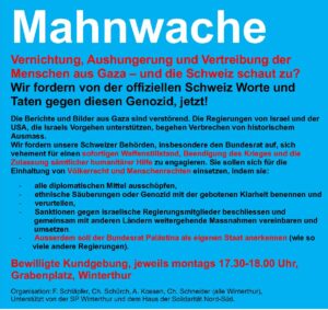 Wir fordern von der offiziellen Schweiz Worte und Taten, die dem historischen Ausmass der katastrophalen Situation gerecht werden. Die Berichte und Bilder aus Gaza sind verstörend. Die Regierungen von Israel und führenden westlichen Ländern, die Israels Vorgehen unterstützen, begehen Verbrechen von historischem Ausmass. Länder wie die Schweiz, die nicht angemessen reagieren, sind Teil des Problems. Wir fordern unsere Schweizer Behörden auf, sich vehement für einen sofortigen Waffenstillstand und die Zulassung sämtlicher humanitärer Hilfe zu engagieren. Sie sollen sich für die Einhaltung von Völkerrecht und Menschenrechten einsetzen, indem sie: